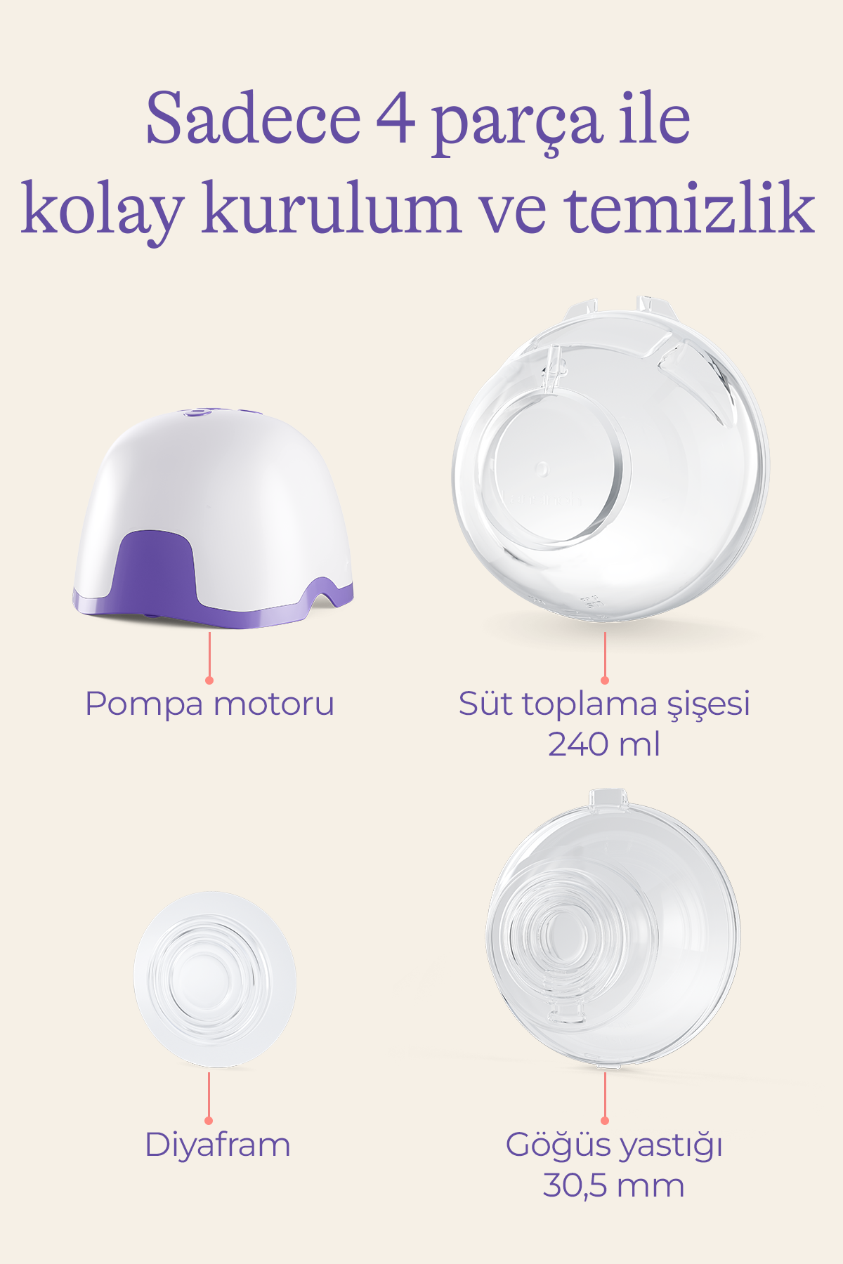 1 pompa motoru, 240 ml kapasiteli 1 süt toplama şişesi, 1 diyafram, 1 göğüs yastığı (30,5 mm), 2 silikon uç (21 mm ve 25 mm), 1 USB-C Şarj Kablosu ve 1 taşıma çantası kutu içeriğinde yer almaktadır.